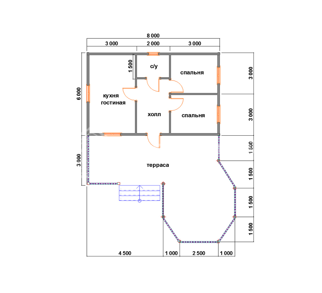 | Сруб дома | Профилированный (строганный) брус 90х140 мм (140х140 мм / 140х190 мм). Атмосферной сушки. Тип бруса на выбор: полукруг (под блок-хаус) или прямой. Все проемы окон и дверей перевязываются. |