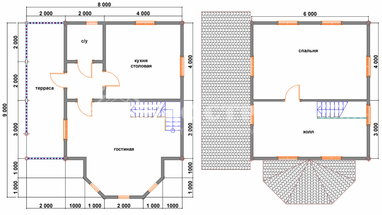 | Стены 1 этажа | Брус профилированный (строганный) (140х140 мм. / 190х140 мм.) естественной влажности. Тип бруса на выбор: полукруг (под блок-хаус) или прямой. Все проемы окон и дверей перевязываются. |