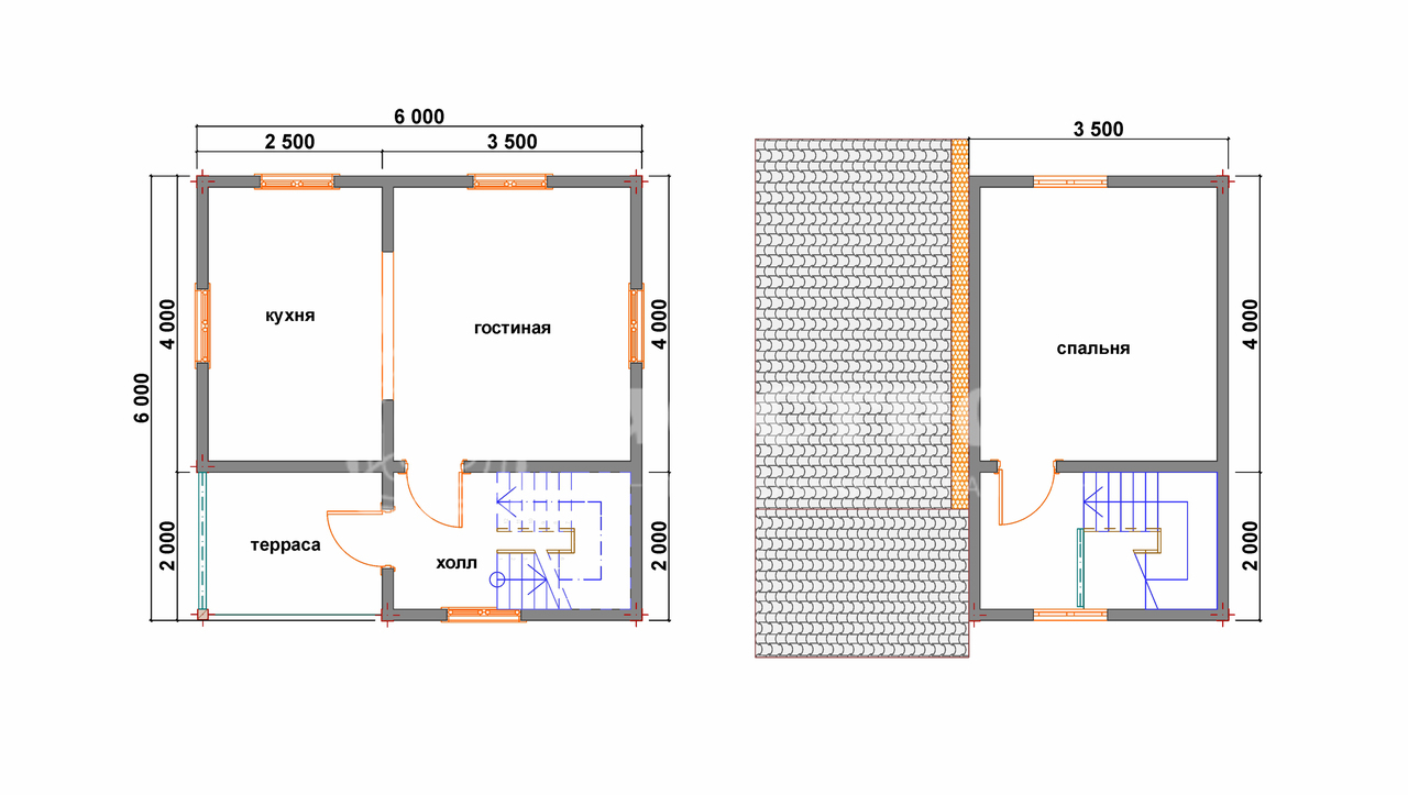 | Стены 1-го этажа | Профилированный (строганный) брус (140х140 мм. / 140х190 мм.) естественной влажности. Тип бруса на выбор: полукруг (под блок-хаус) или прямой. Все проемы окон и дверей перевязываются. |