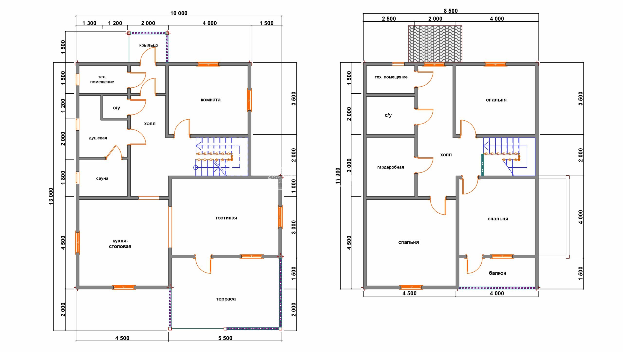 Стены 1 этажа | Профилированный (строганный) брус (140х140 мм. / 140х190 мм.) естественной влажности. Тип бруса на выбор: полукруг (под блок-хаус) или прямой. Все проемы окон и дверей перевязываются. |